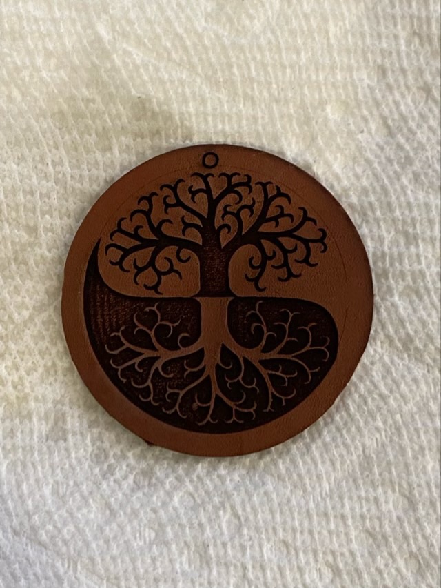 Photo description: Caryn’s Creations tree logo burned into tooling leather with a laser cutter
