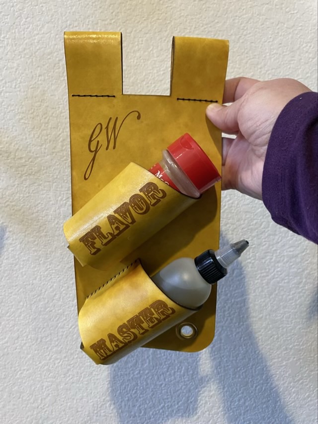 Photo description: Finished spice holster with one spice jar and one hot sauce bottle and the words “Flavor Master”