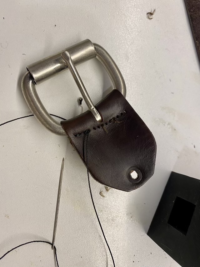 I used waxed linen cord and the saddle stitch to sew the new buckle into the leather. I made the final knot between the layers of leather so it would be hidden.
