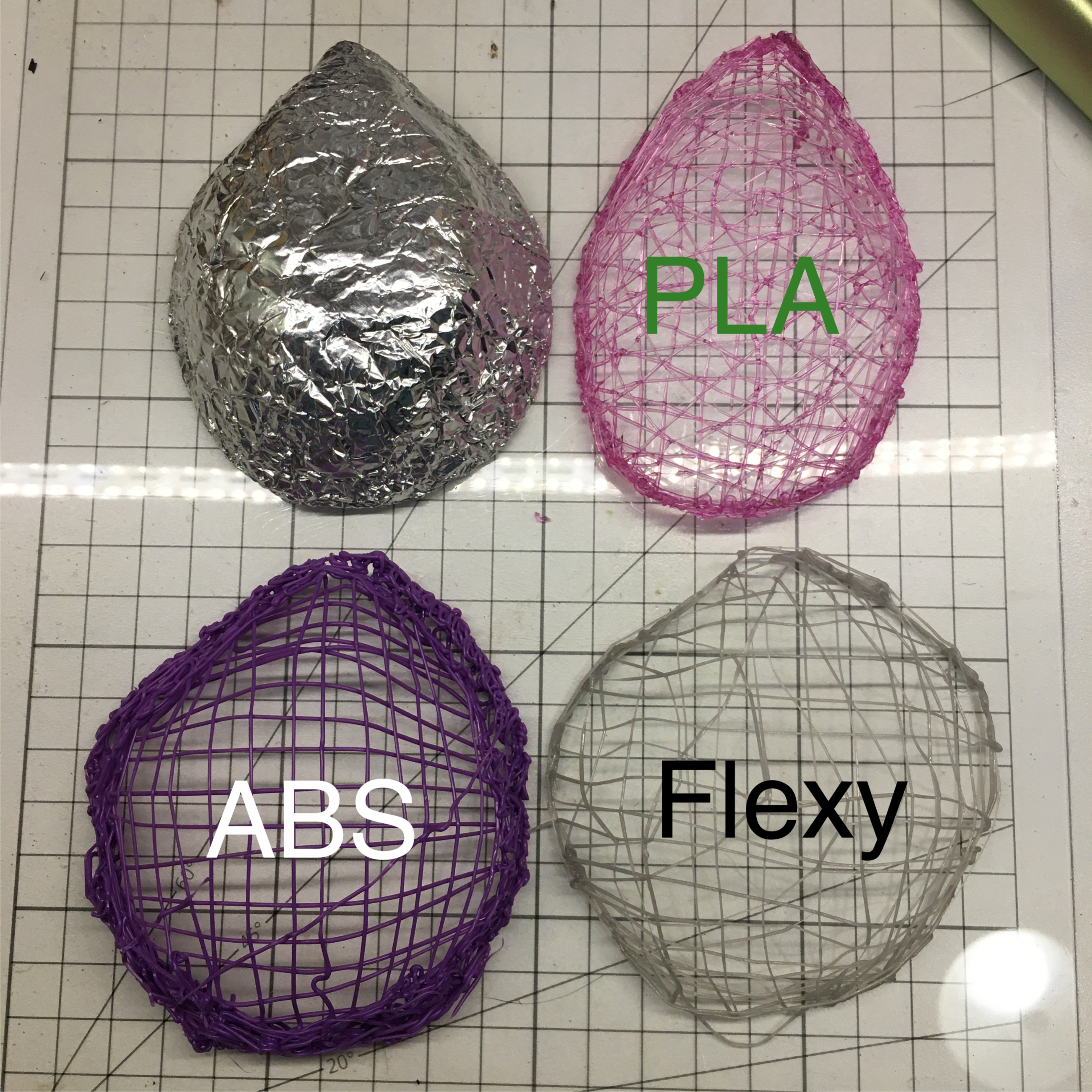 I used a chenille stick and aluminum foil to make a form for the mask. The plastic (PLA) stuck just enough to temporarily adhere to the form, which made forming the plastic easier. The ABS was harder to work with, but I found making small overlapping circles worked better than making long straight strings. The flexy was interesting to work with as the resulting mesh is very flexible, but it didn’t have enough strength to be a frame. I also did some destructive testing, because I would rather know how it breaks before I sew it into a mask. PLA and ABS do break when pressed flat, but not as much in the areas made of overlapped circles. I settled on using PLA and tiny circles, and managed to make and destructively test one frame before the pen broke. Ugh. I decided to just order some from Amazon. Then the first order was lost. Still waiting on the reorder.