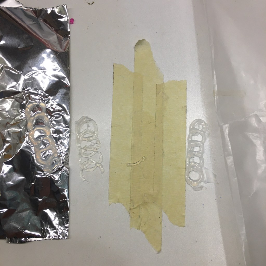 First I tested the adherence qualities of my all temperature hot glue by applying it to aluminum foil, masking tape, and wax paper. Once cool, the hot glue would not come off the aluminum foil, tore off strips of wax paper, but removed cleanly from the masking tape.