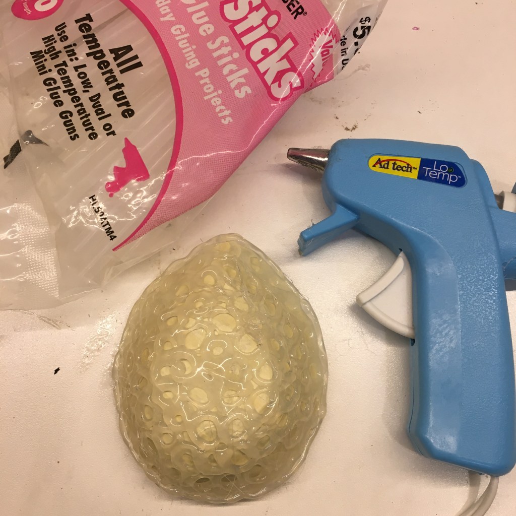 To make a mold, I fit a chenille stick around my daughter’s nose and mouth, then sculpted aluminum foil around the chenille stick to form a dome. I then covered it with three layers of masking tape. With the hot glue I made small connected circles over the entire mold. I used all temperature hot glue with a low temp glue gun.