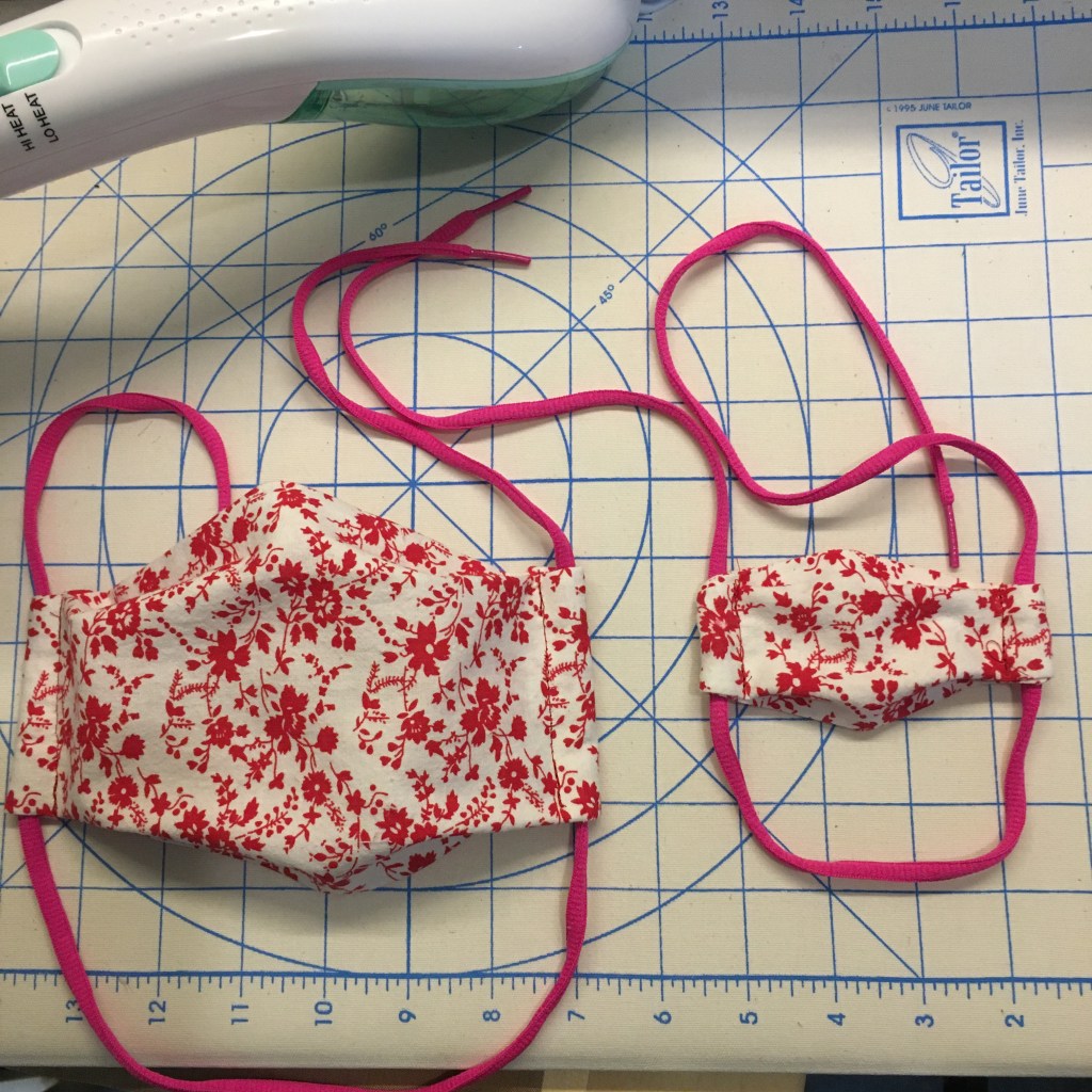 I also enjoy seeing the steamer do its work on the masks after they come out of the wash. I straighten out the wire, then steam the mask mostly flat. I’m sure there are wizards of ironing out there that could make them as crisp as new; I don’t have that patience, but I do appreciate storing mostly flat masks. Yes, these masks follow the first pattern I made in bulk. For the kid size, instead of starting with a 10”x14” piece of fabric, I downsized to 8”x14”. This pattern stores nicely, fits nicely, and is easy to make in an assembly line method, which means I can make more a little faster!