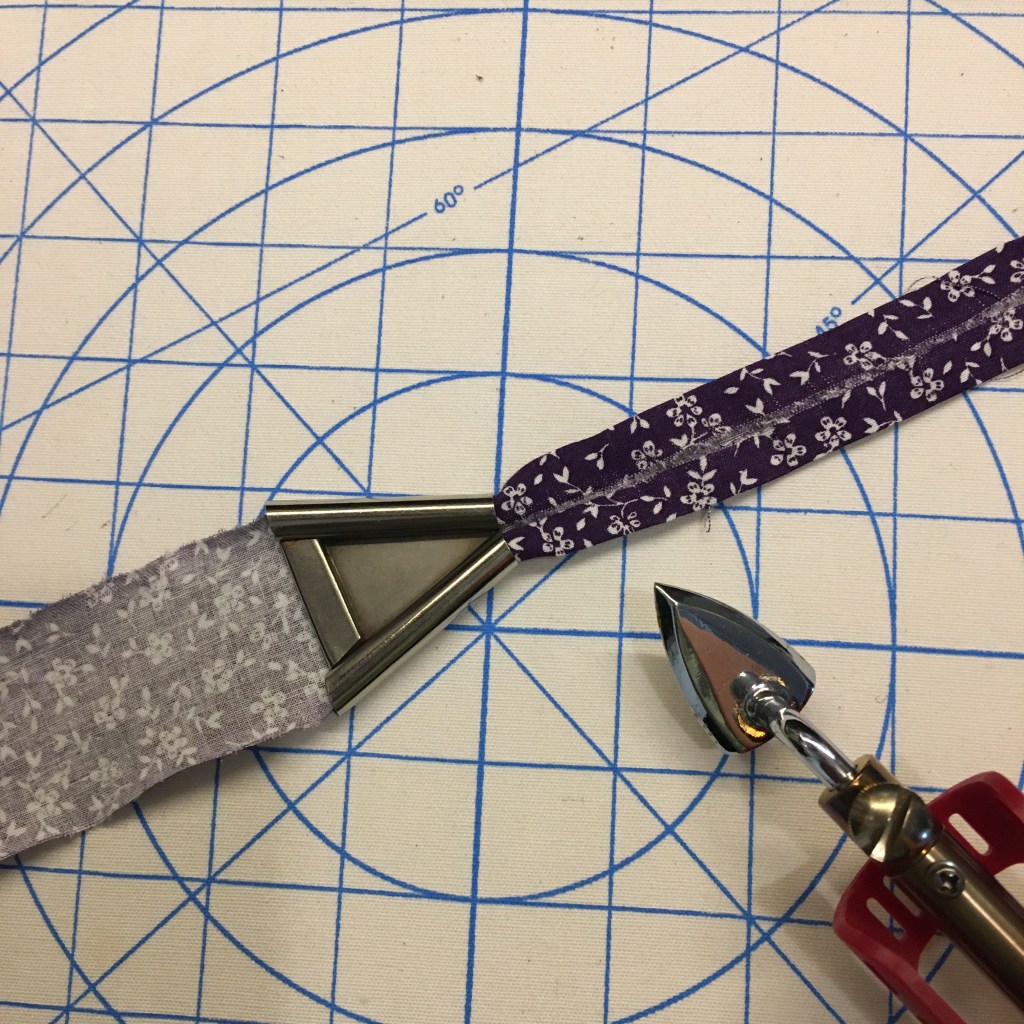 This tool makes 3/4” single fold bias tape. For garments, bias tape is cut on the … wait for it … bias. Which means at a 45 degree angle to the fabric grain. It makes a tape that is more flexible than those cut along the grain. But I am making fabric ties from scrap fabric, so I can get more by cutting with the grain. (Here is a great blog post about bias tape, if you want to know more from a quilter’s perspective.)