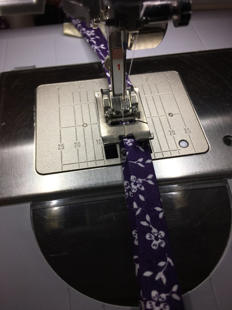 To make the ties, I fold the single fold bias tape in half to make double fold bias tape (it is nice when nomenclature makes sense). I then sew along the edge to finish the tie. I do tuck in the ends so they are neat. The mask pattern I’m using has a pocket for the ties (or elastic if you have it), which I really like because it means I can have ties that slide and can be changed out for different ties.