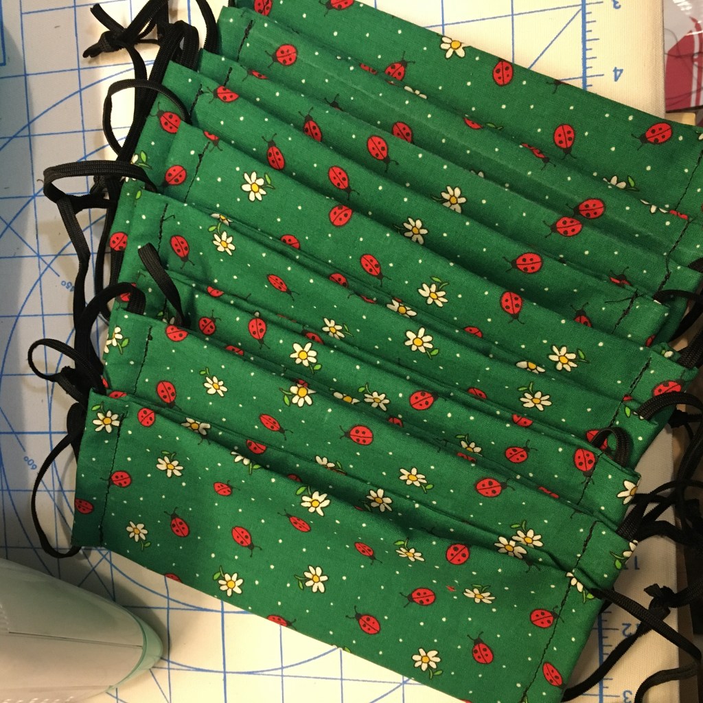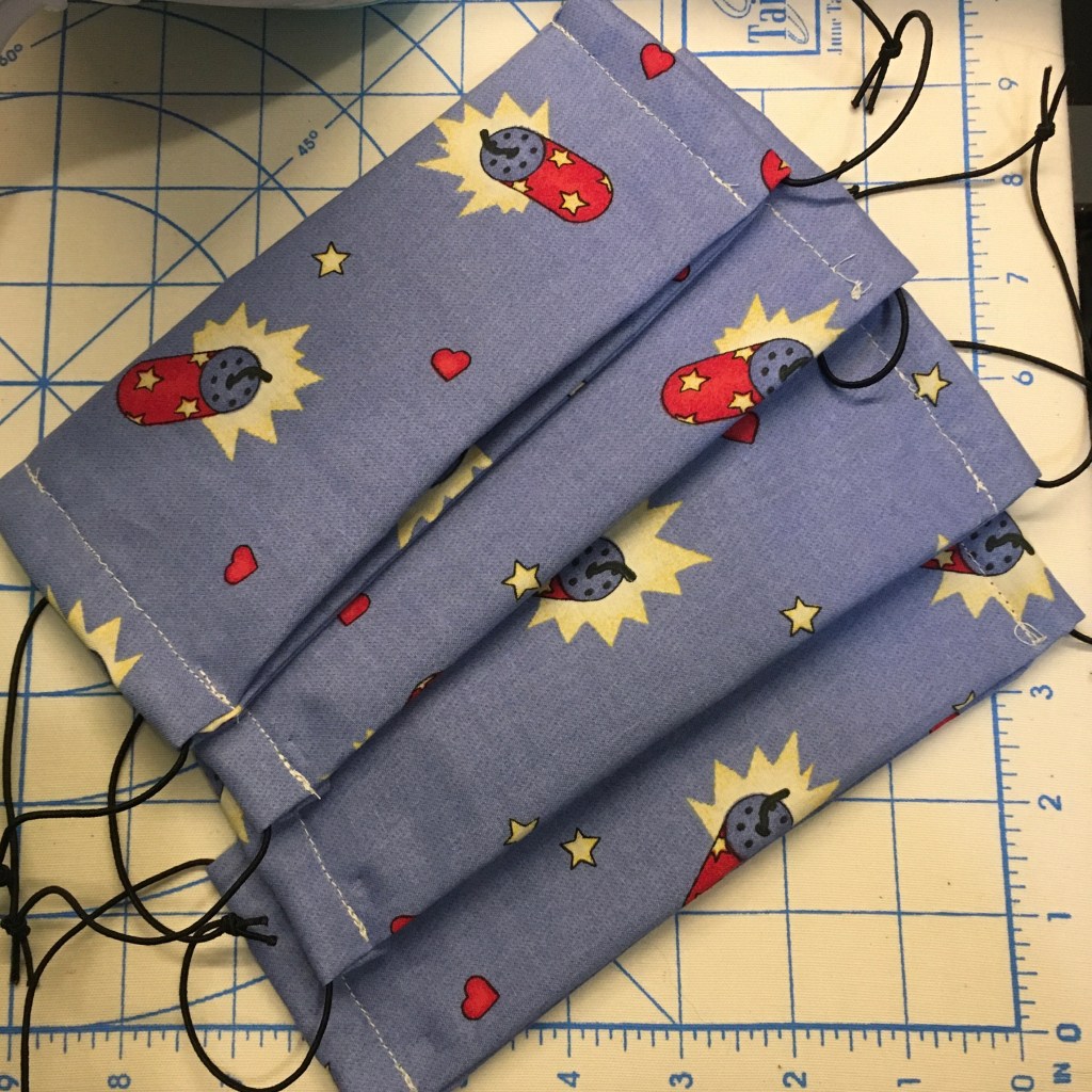 Well, I say production time, but it is really an hour or two squeezed into the day when my youngest is occupied with something that doesn’t need close supervision, like before she wakes up! But I have fabric, and now elastic, and am a decent seamstress, so I feel like this is a way to make a contribution.