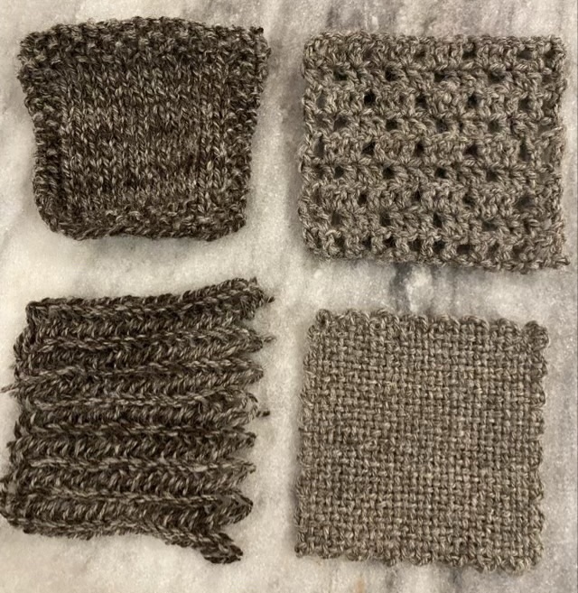 Photo description: four squares made from hand spun Jacob’s wool: knit (top left), crochet (top right), cut open nålbinding (bottom left), woven (bottom right)