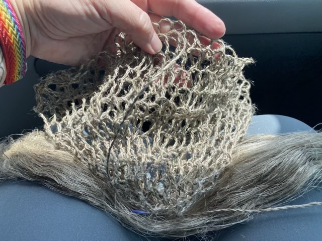 After about 14 hours of riding in the car, I figure I have put about 12 hours into my loop and twist bag that I am twining from flax fiber as I go. I like the work because I can enjoy the scenery as we drive. I can both twine and loop mostly by feel (I do look when I join in new fiber.) I’m drawing my fiber from the center of the bundle, which I don’t think is the best way, because I’m getting tangles that have to be pulled out. I tried from one end, but the tangles were worse. I should lay out the fibers like flax spinners do, but space in the car is limited, and flax fibers can be over three feet long. The plan is to continue to twine until I run out of untangled fiber, then clean up the tangles and twine the string for the closure.
