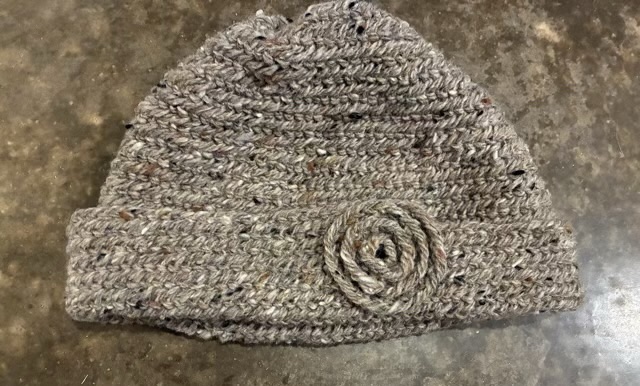 I didn’t want to finish the hat with decreases, so I stitched a free length of Oslo chain, spiraled it into a rosette, and stitched down the bottom edge.