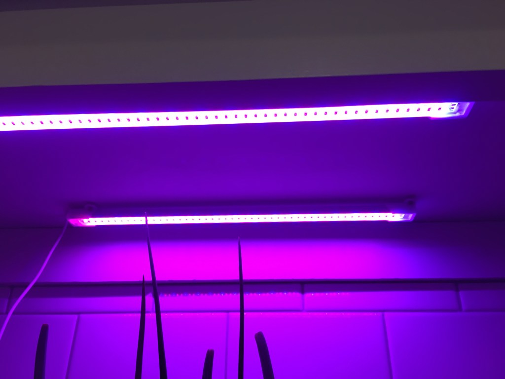 Most of our windows are north facing, which is good for not heating up the house in the summer, but not so good for growing green onions in the winter. So to boost the light level, I purchased some LED grow lights strips and installed them under my cupboard in the kitchen.