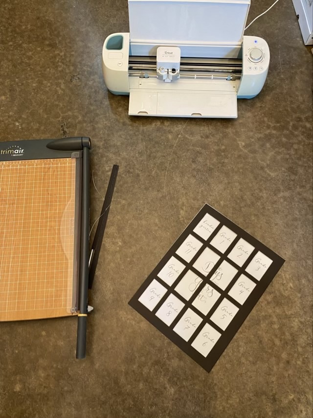 The resulting mat has spaces for 16 2×3 inch photos for my youngest’s school photos. All the commercially available mats only had 13 spaces, kindergarten through 12th. I needed spaces for preschool too. I bought mats larger than the frame, which allowed me to trim down the outside with my paper cutter and make sure the Cricut cut rectangles were centered.
