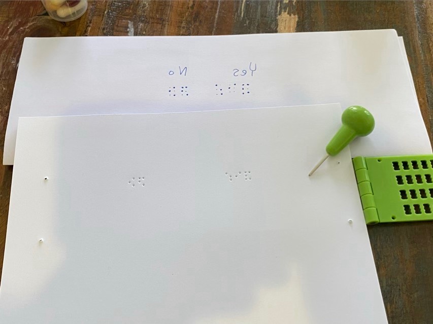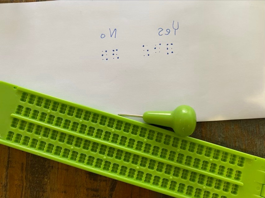 Our chorus was taking a private paper vote and we have a member who reads braille. Making the ballots inclusive was important to me and appreciated by her, and it only took a 15 minutes. I found a braille slate on Amazon, which is a small frame and stylus that makes it easy to get the right spacing for the braille dots. The frame is inexpensive, so I didn’t need to invest in a Braille Writer, which would be good for larger projects. The trickiest part is forming the letters, called cells, backwards. I printed the ballots on card stock because the thicker paper holds the embossed braille better, then used the braille slate to mark “yes” and “no” on each ballot so they were all the same. The ballot was read out loud to all members, then we all marked our ballots with pencil.