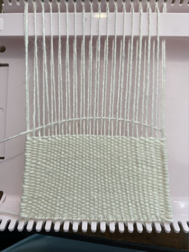 Photo description: Ramie chain-plied yarn warped onto a Clover mini loom and done halfway in plain weavePhoto description: same picture, but with the visible chain bumps circled in blue, and one weaving error circled in red