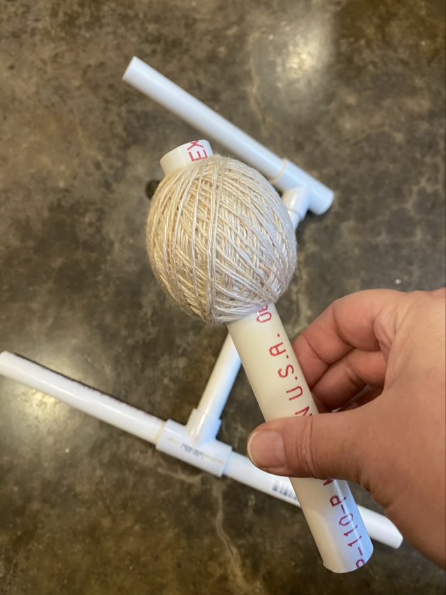 Photo description: nostepinne style ball wrap on a PVC pipe from a home made niddy noddy