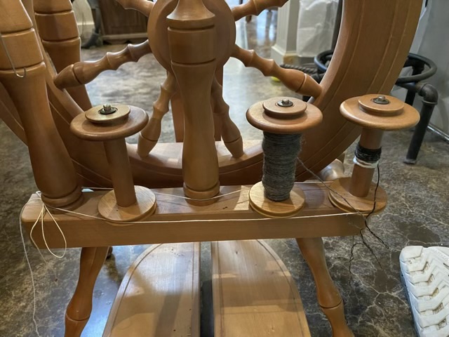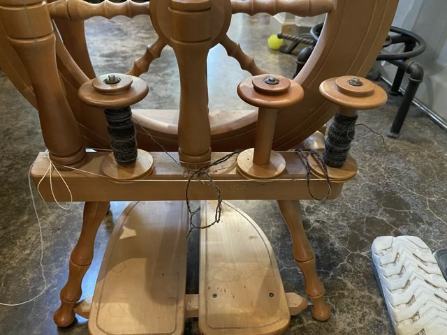 Photo description: three bobbins full of spun singles on an Ashford Traveller spinning wheelPhoto description: jumbo Ashford bobbin full of three-ply Jacob’s wool yarnPhoto description: left over dark and silver marled yarn with the middle bobbin emptyPhoto description: three-ply yarn made with two dark singles and one silver single Photo description: left over yarn from round two of plyingPhoto description: four bobbins of three-plied Jacob’s wool yarn in four colors