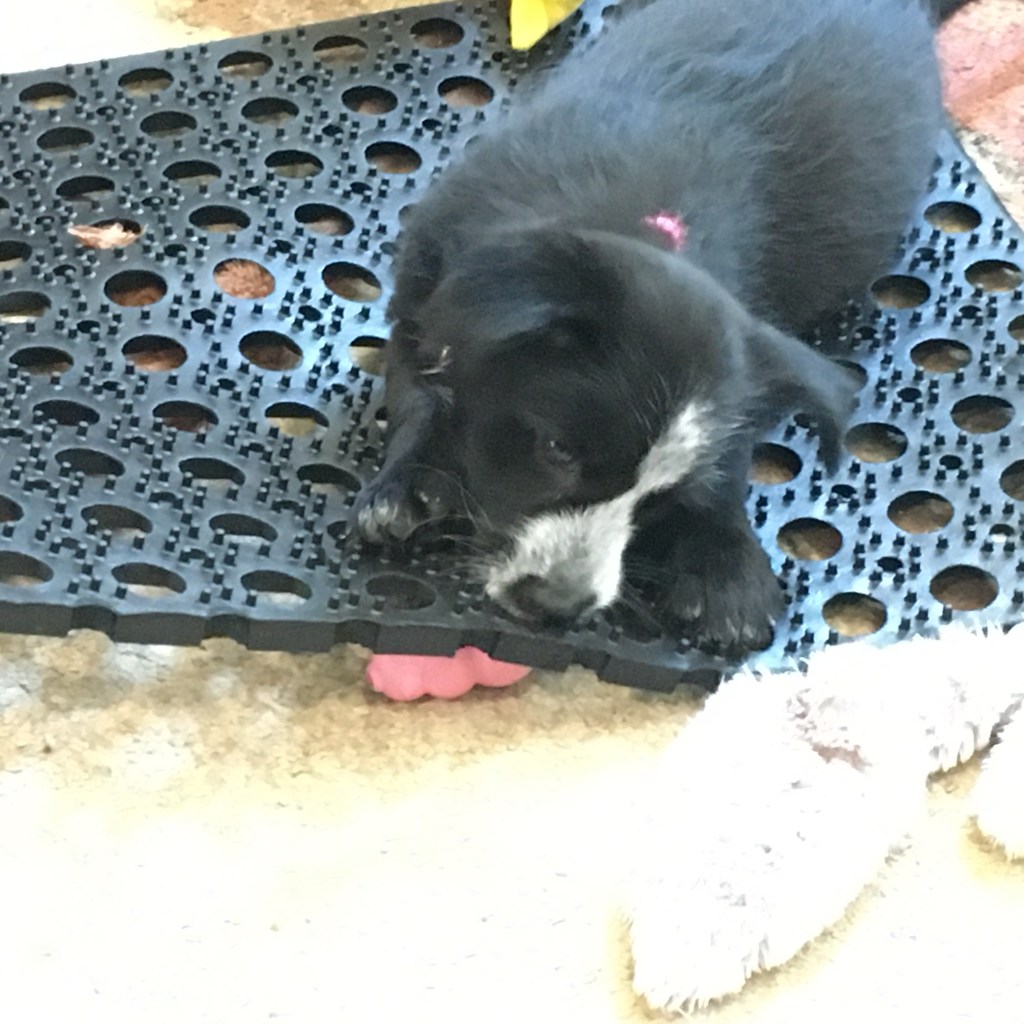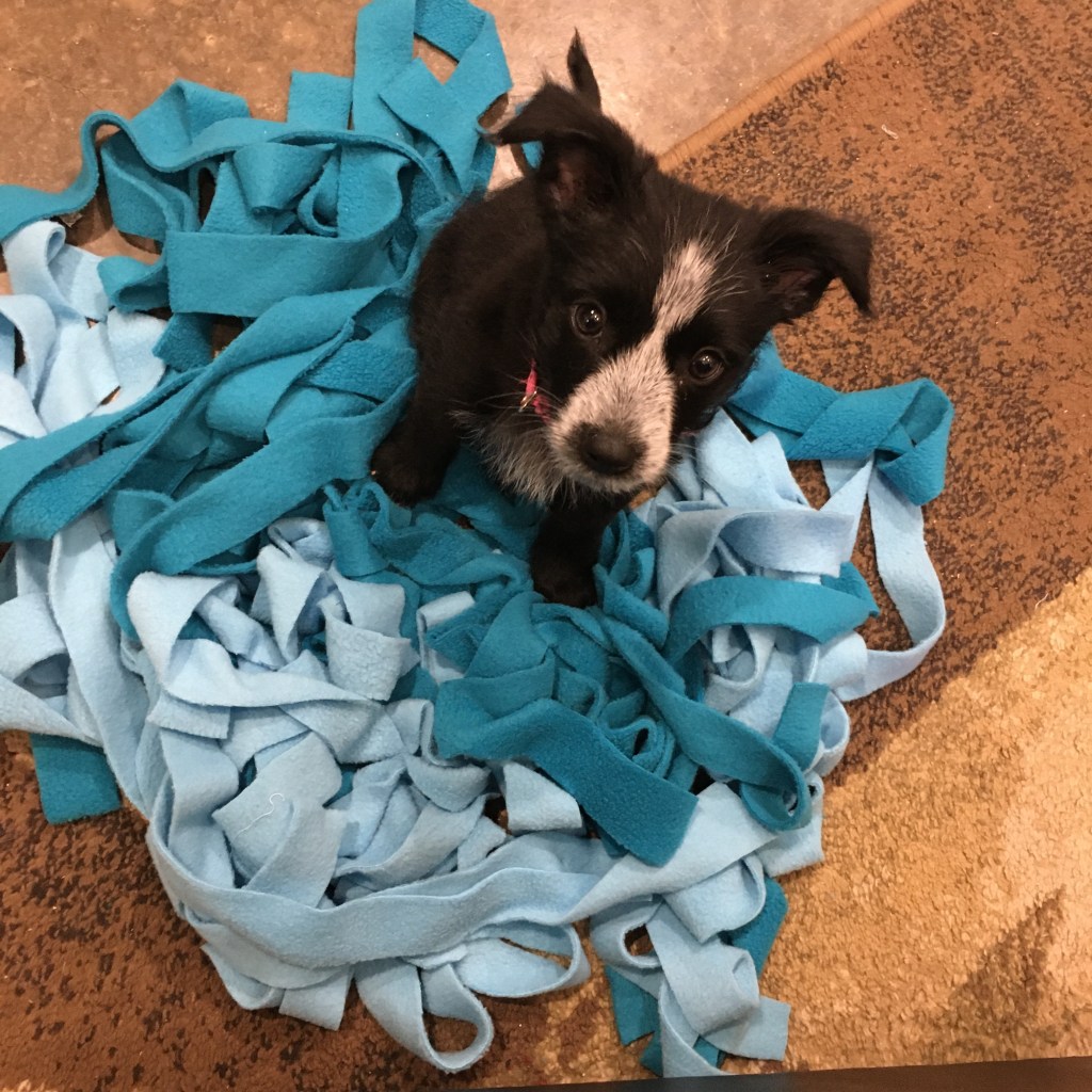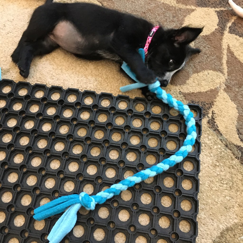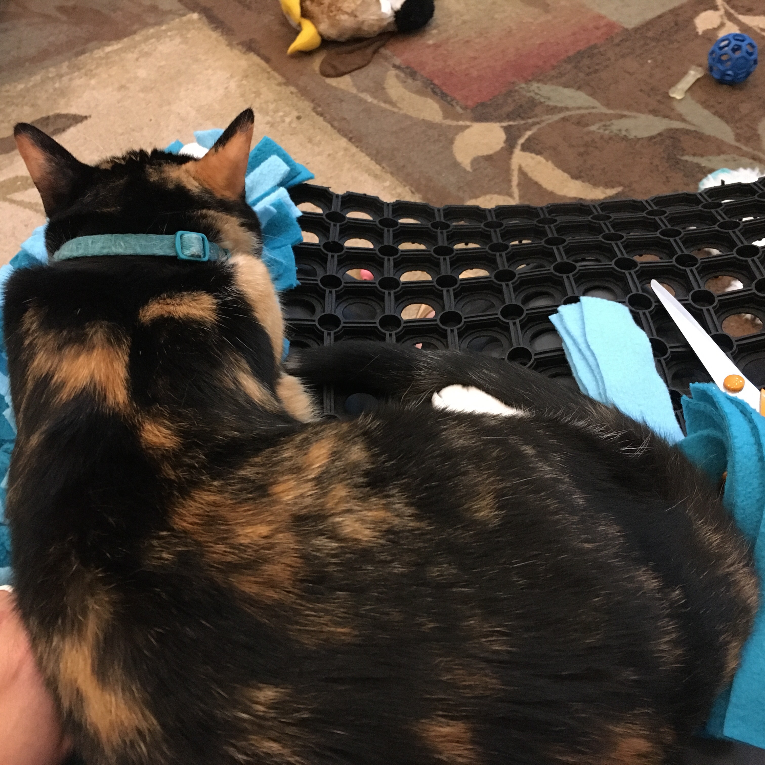 After the mat dried, I tied on the remaining strips. I started with four per large hole, but felt it was thin, so added a couple to each small hole. Because my mat has small holes and large holes, I could have done more, but I didn’t have enough fleece! As it was, I used up all two yards on a 16 inch by 16 inch mat. Missy likes it! But it only goes on the floor strictly supervised.