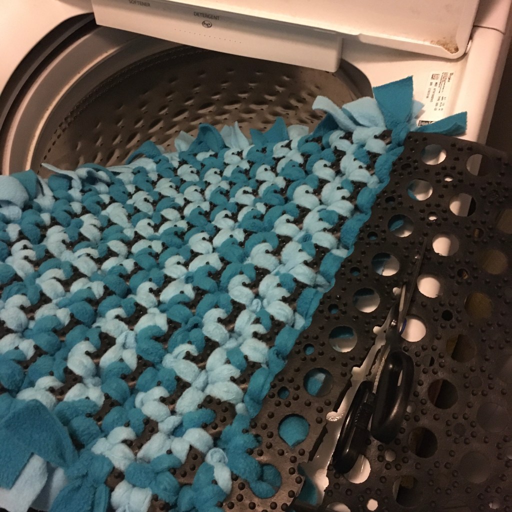 After a couple of days tying in fits and starts, I hear my eldest yell “She just peed on the rug!” Yup. On the unfinished hand-tied snuffle mat. I had left it beside my chair, and while potty training is progressing, she is obviously not at 100%. It was time to wash the rug!