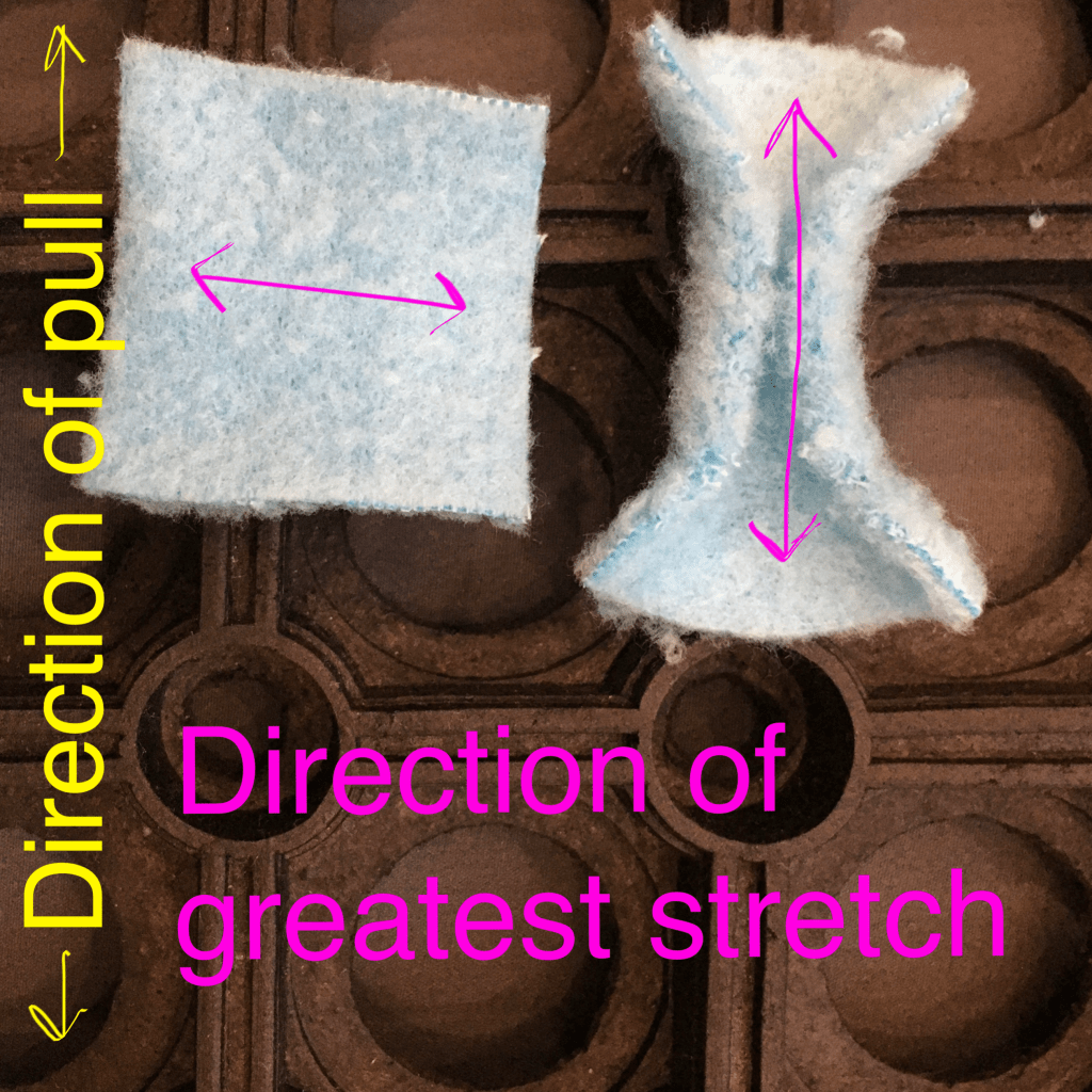One of the things I didn’t see in the tutorials I read was that the direction the fleece strips are cut matters. If you cut strips in the direction of the greatest stretch, the strip will curl up when you pull on it. If you cut it perpendicular to the direction of the greatest stretch, the strips will not curl. I chose the no curl method.
