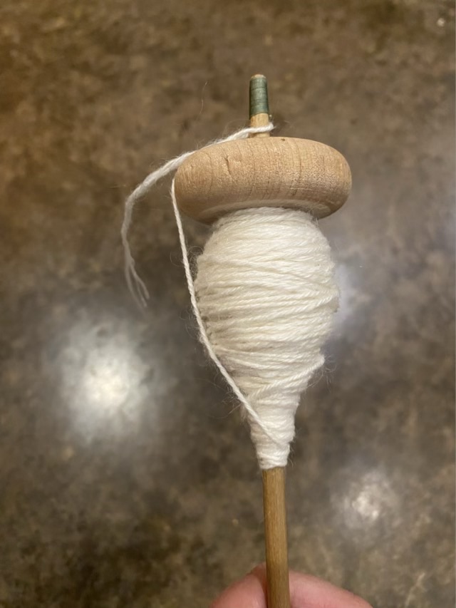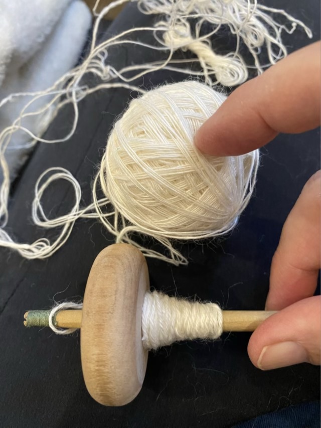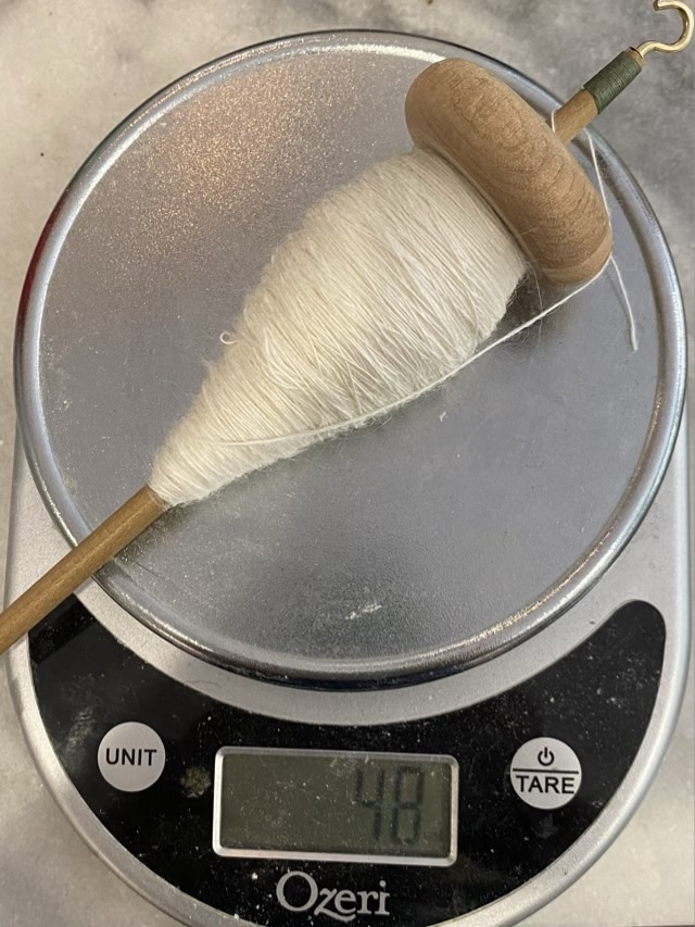 It is so fine that I decided to divide the yarn and make multi ply yarn. I weighed my full spindle, and since I had the spindle weight marked on the whorl (22g), I knew I had 26g of yarn. I wrapped a center pull ball of yarn that weighed 12g and set it aside to try chain plying, which results in a three ply yarn. I then wrapped two 4g balls and a 10 gram ball. Oops. No worries, I decided to do a four ply by using both small balls, and taking from the inside and the outside of the larger ball. It was tricky to handle, so I made a plying ball, which means I wrapped the four strands of yarn together, without twist, into a center pull ball. There were still some tangles, but they were manageable. I could then add twist as I pulled the four strands from the middle of the ball.