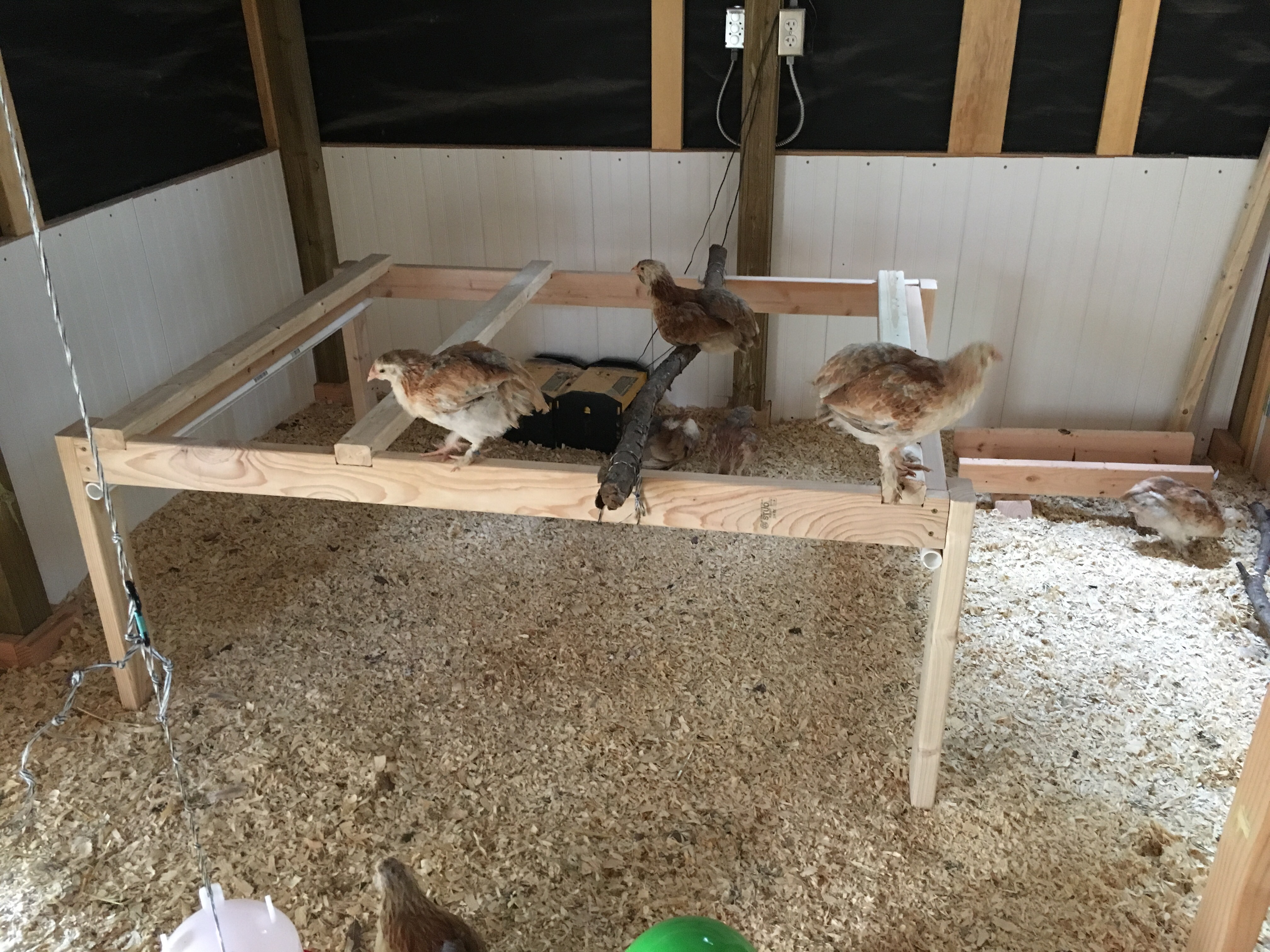 The chicks are having fun jumping up on the roosts, and really like the stick better than the lumber. We’ll see if the preference continues!