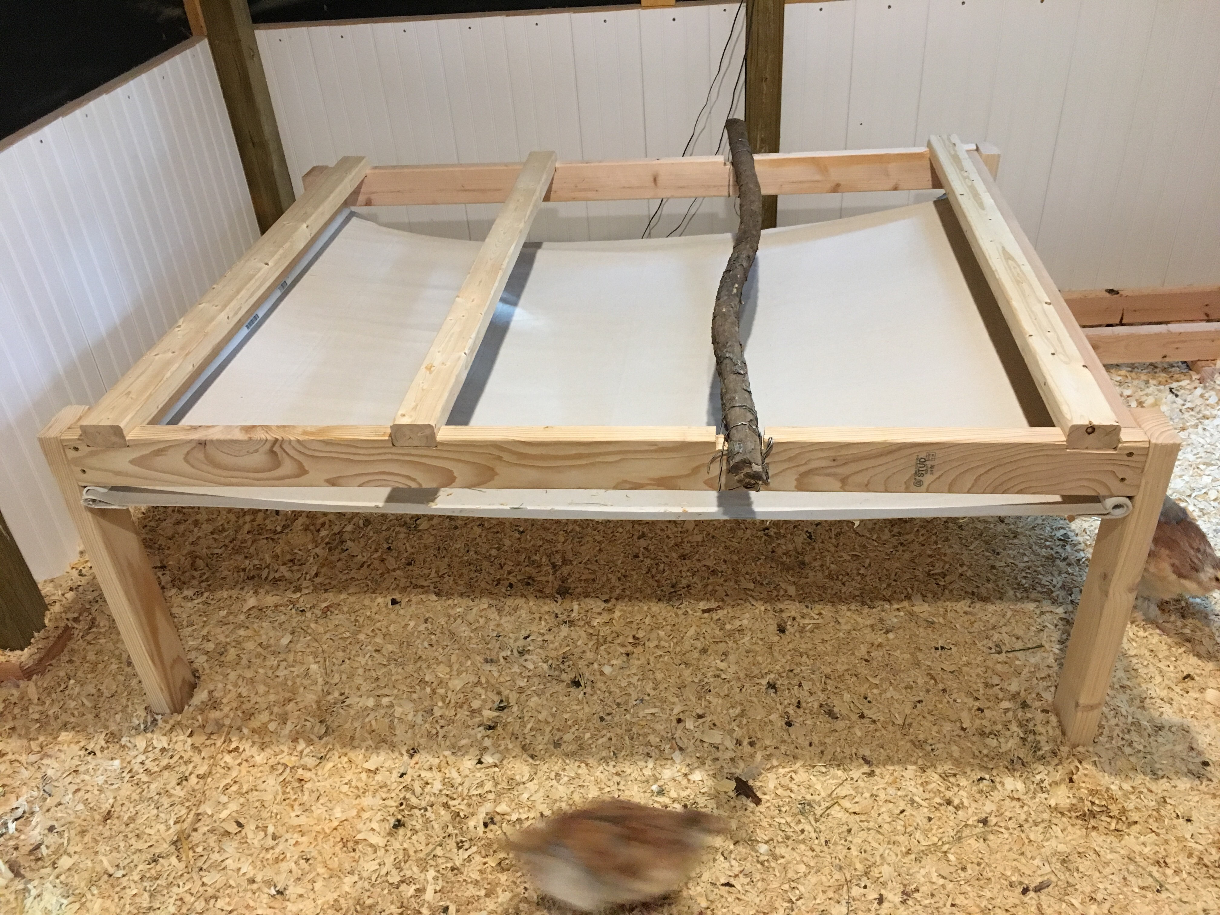 Apparently the poop catcher under the roost is also scary. I noticed that the chickens had stopped even playing on the roost, so I took out the poop catcher, changed out the wobbly branch and put the 2×3 back in. The chickens appreciate the change.
