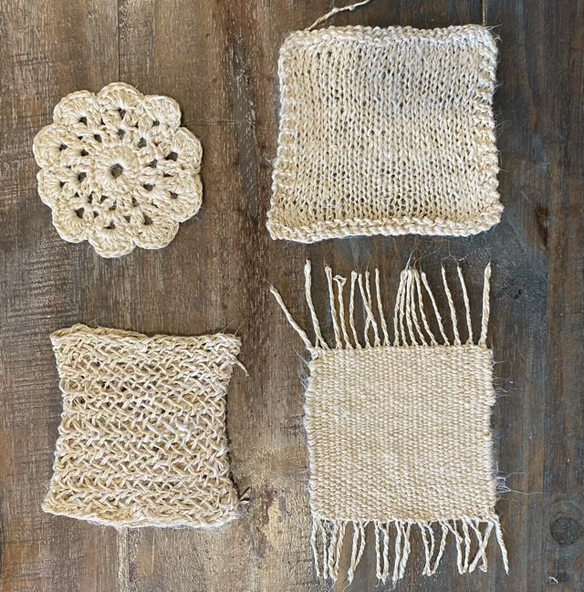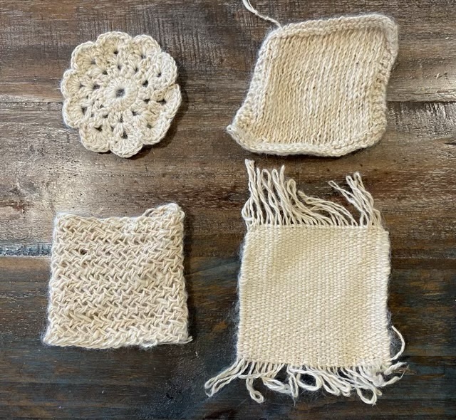 I made four example swatches from my spun soybean fiber: knitting, crochet, weaving, and nålbinding.
