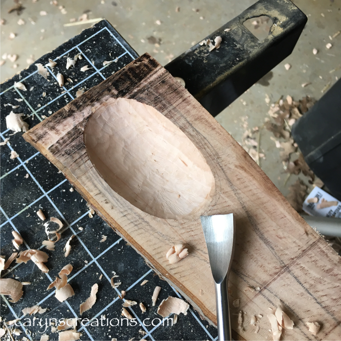 I cut a piece of applewood and used a fishtail gouge to shape the bowl of the spoon