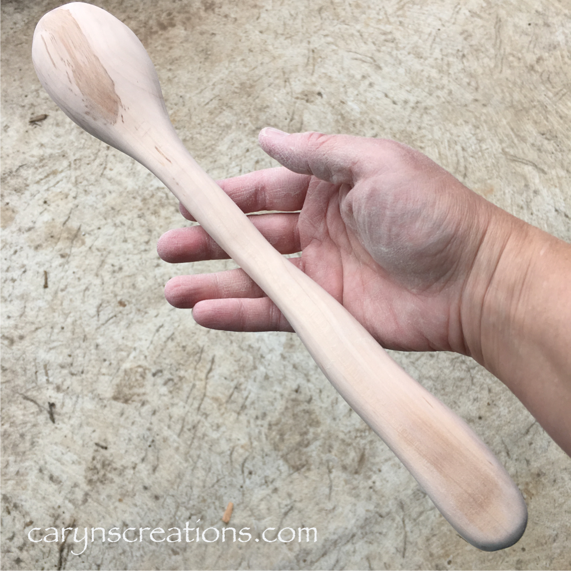 After sanding down with progressively finer grit sand paper, I wet the spoon with water. The water helps raise the tiny splinters in the wood, and also gives you a good idea of what the final color will be.