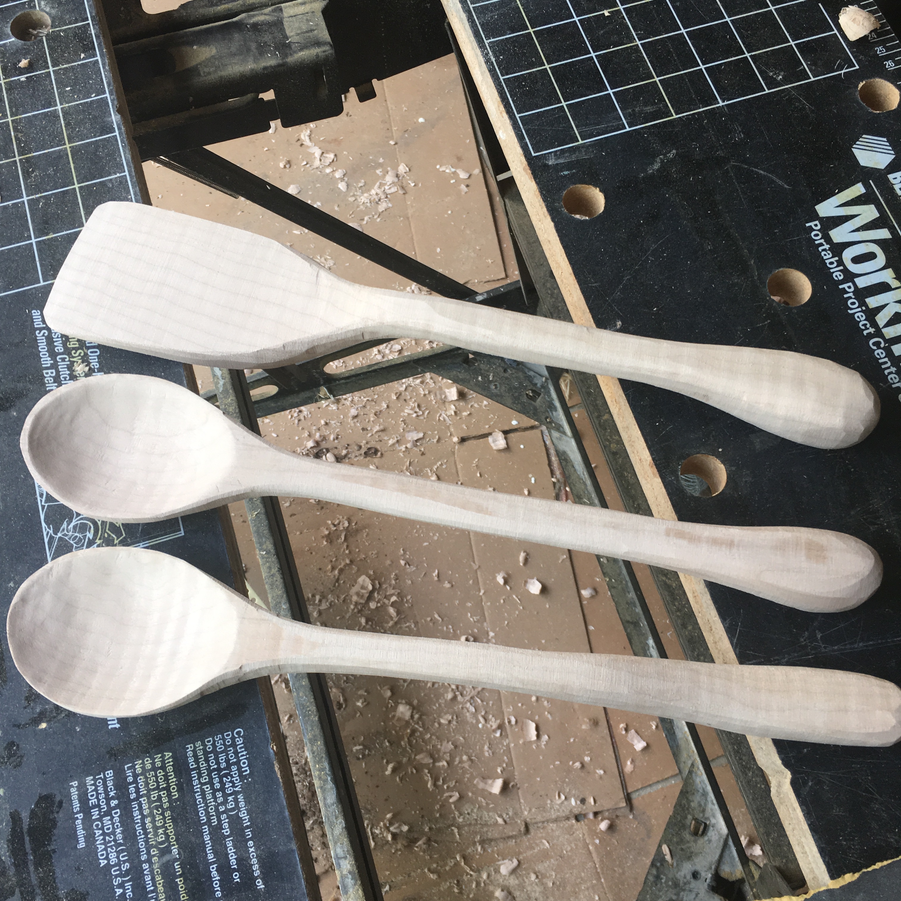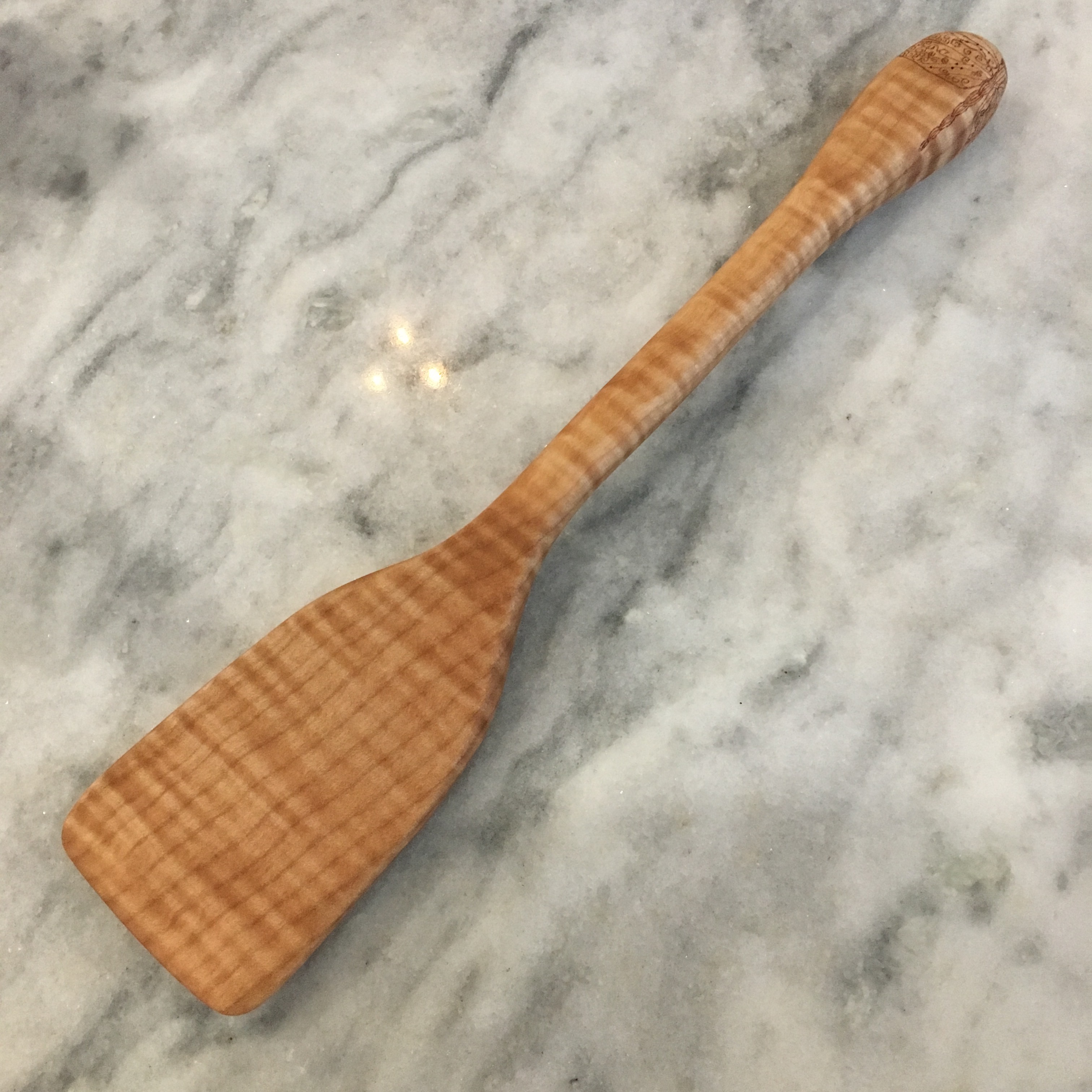 I found a piece of flame maple at a woodworking store and made three utensils: two spoons and a spatula. The “flames” in the wood grain really shine once the utensils are finished!