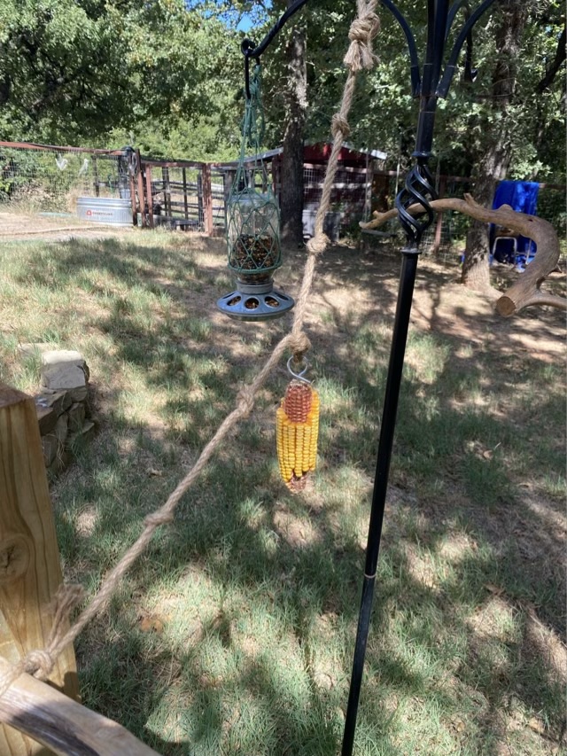 Our dried corn cob holder for the squirrels broke, so I found a replacement. It has screw eyes to hold five cobs on a rotating hub.