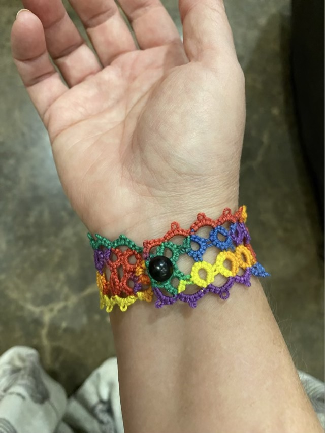 I decided to make a tatted swatch with my hand spun mint infused yarn. This is definitely the longest time I’ve ever spent on a swatch, all those little knots. I can attribute some of the unevenness of the knotting to variations in spin thickness, but my plan of attack also needs some adjustments. I tried making the first turn from row 1 to row 2, which turned out wonky. For row 3, I ended row 2, and started row 3 separately then joined it to row 2, which worked better, but still isn’t balanced.