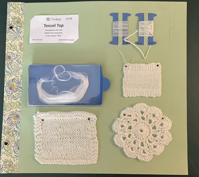 The next completed fiber study page is for Tencel. Tencel is made from wood pulp and the combed fiber is shiny and silky looking, but it is not easy to draft consistently. I want to like it because it is made from waste product, but it fought me when I was spinning. Maybe it would be better if it were blended with something. Blending fibers is another whole rabbit hole.
