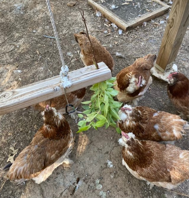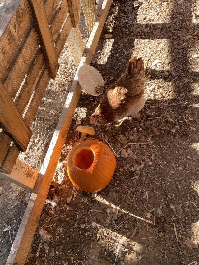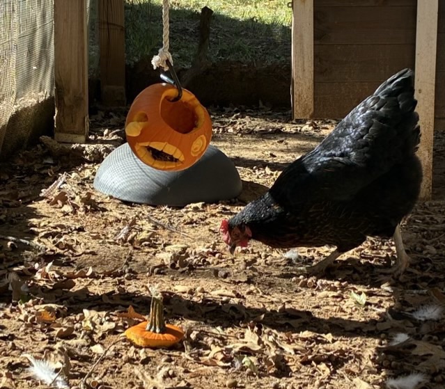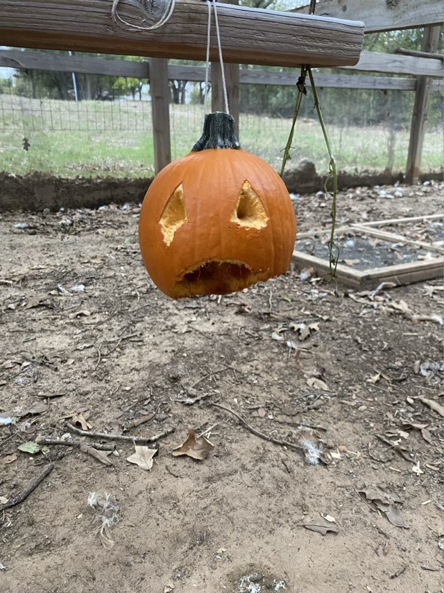 I hung the pumpkin up for the chickens using a carabiner clip. Last year I remembered to cut the bottom out to scoop out the seeds so the pumpkin could hang from its stem. I forgot this year, but it looks a little like the pumpkin is horrified that it lost it’s lid, or that a hen is coming.