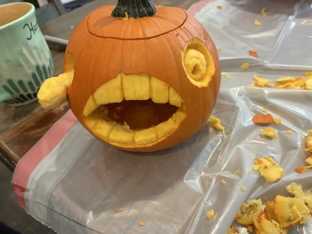 Full disclosure, I bought pumpkins before Halloween, but we didn’t get round to carving them until after. I think this might be the second year this has happened, maybe the third. Hm. I specifically bought pie pumpkins so they could nourish the chickens after carving. The large carving pumpkins are stringy and the hens don’t care for them as much. Since at least one pumpkin was going straight to the chickens, I had to give it a horrified look.