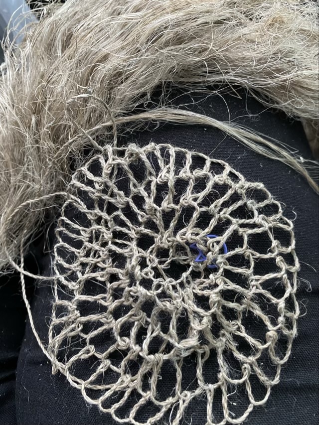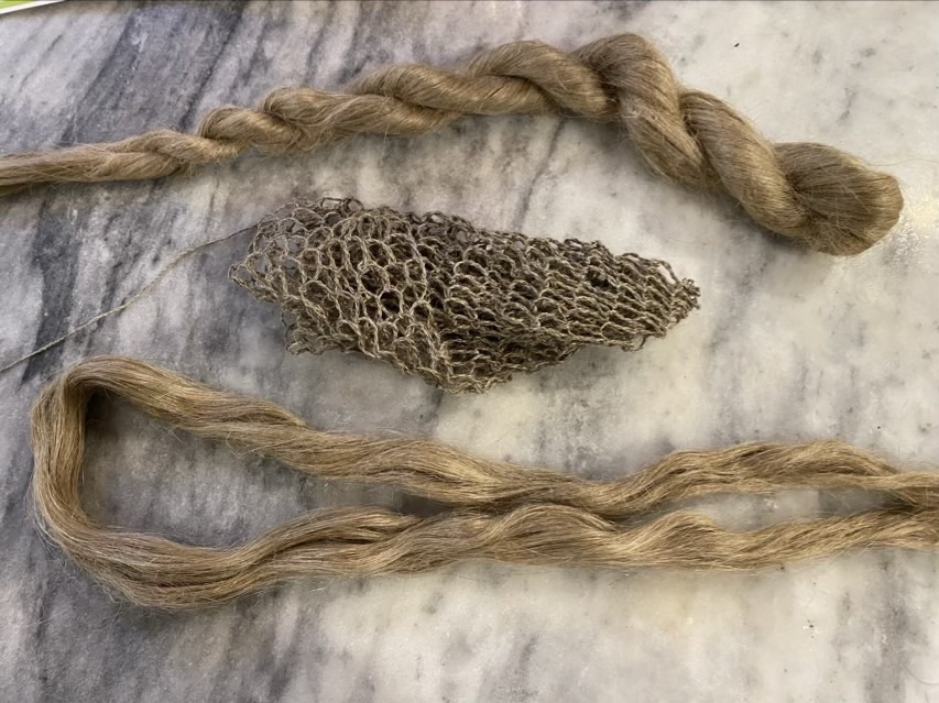 I finished twining and stitching a linen string bag using long line flax and a loop and twist construction. I would twine a section, then loop that section, so the bag was made with a continuous length of string. I did not used any tools other than my fingers. As you can see in the photo above it looks a little wonky. I took it to the sink, gave it a soak in tap water, then laid it out to dry. The transformation was remarkable.
