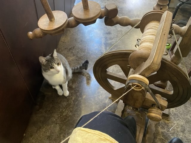 I pulled out my spinning wheel and realized that it has been a long time since I spun with it. Thor the cat has never seen it in action and he is nine months old. Hm. He was quite fascinated with the process, and after this photo had to be told to knock it off as he went for the wheel and the yarn.