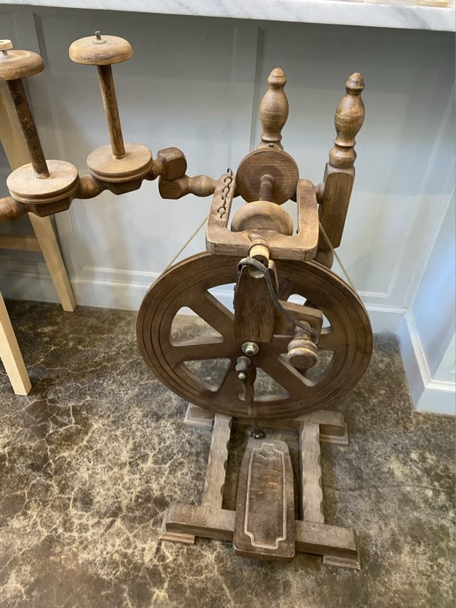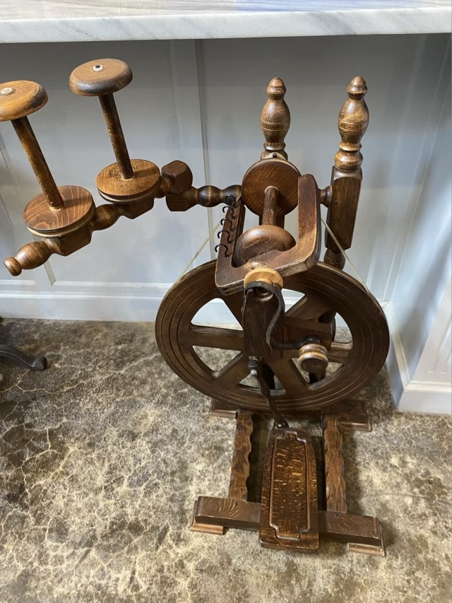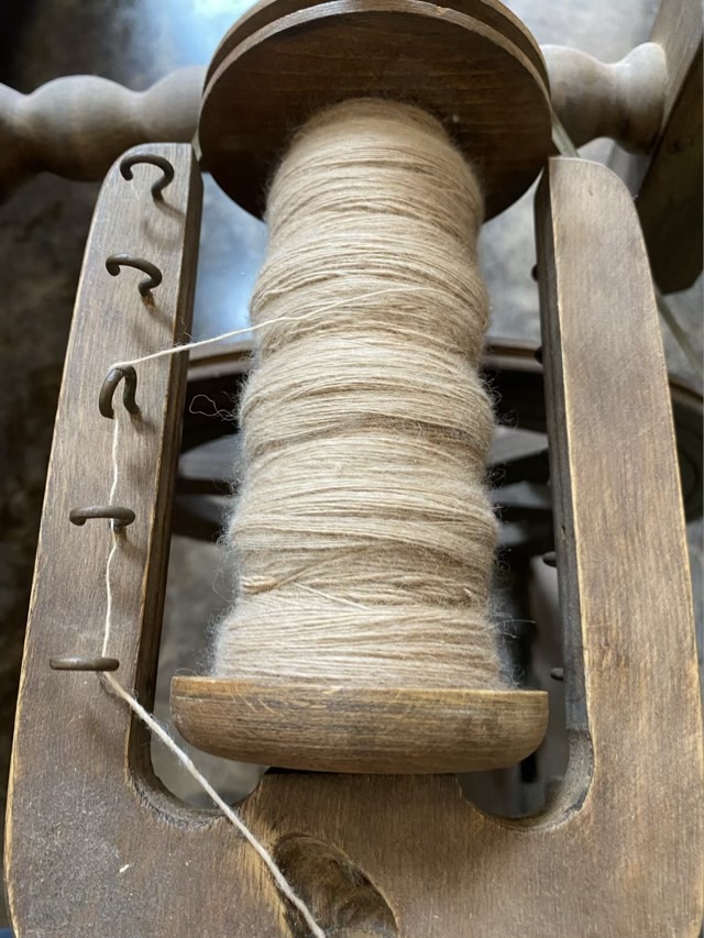 Photo description: Befra Willy Spinning Wheel with a bobbin full of single spun fawn colored alpaca fiber