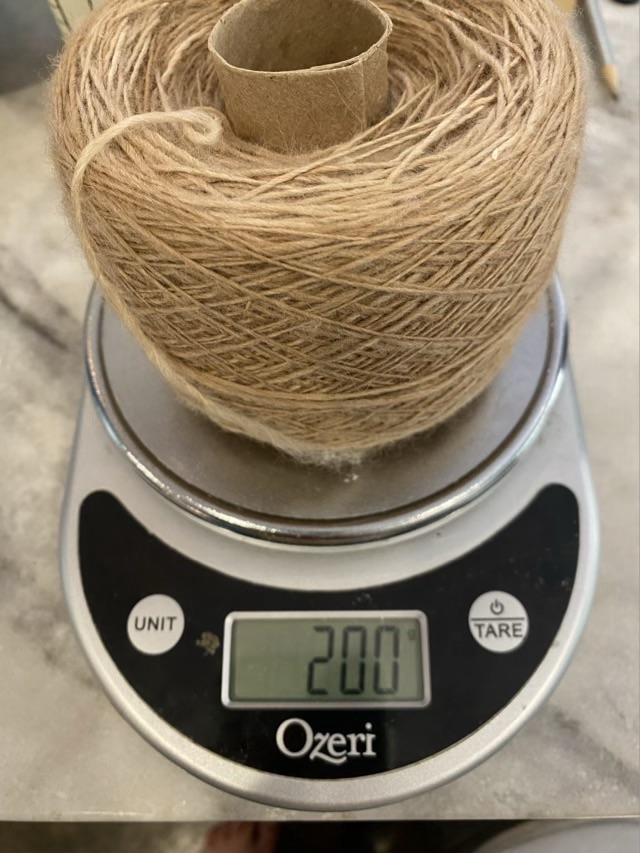 Photo description: cake of single spun alpaca fiber sitting on a scale reading 200g