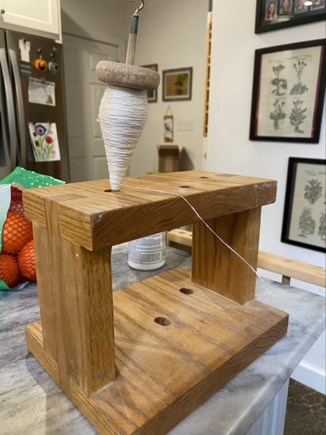 Photo description: oak stand with drop spindle full of single spun mint top fiber which is a cellulose fiber infused with mintPhoto description: Befra Willy flyer and bobbin with three-ply mint infused yarnPhoto description: three ply yarn wrapped onto a PVC niddy noddy