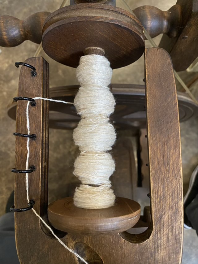 Photo description: closeup of a flyer mechanism on a Befra Willy vintage spinning wheel, with light fawn colored alpaca single wrapped around the bobbin and going through the hooks on the flyer. One hook is turned sideways. The yarn wound on the bobbin is thicker near the hooks, resulting in bumps.
