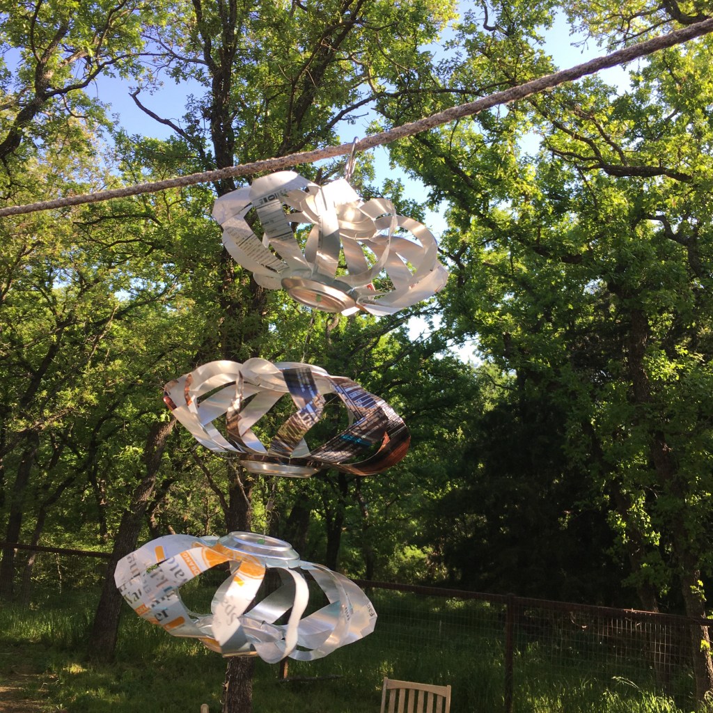 I’ve made more aluminum can wind spinners. As long as I was making, I put together a time lapse video showing my process for making them. My written instructions are on a previous post here. I had the idea of mounting a whole string of these as a column! So much spinning joy!