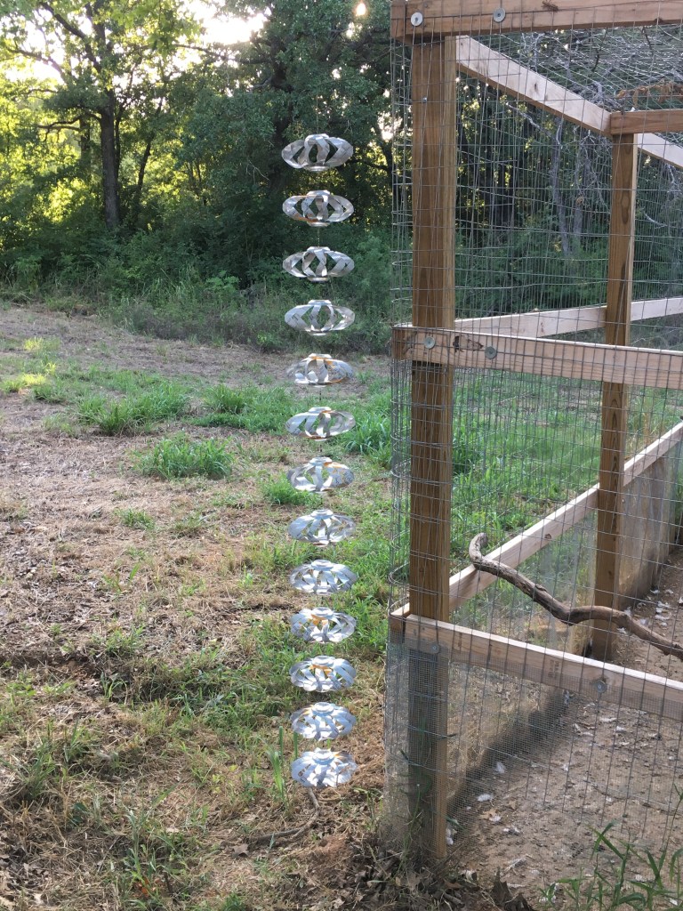 I used lath screws to attach the brackets to a corner of the chicken run. I started with the top bracket, then hung the column of wind spinners. I attached the bottom bracket to hold the column steady so the wind doesn’t blow it into the structure. When complete, it looks like the column is floating, which is a nifty bonus!