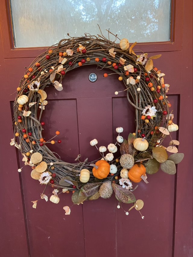 Photo description: Fall wreath on a red front door with faux pumpkins, orange and red berries, and leaves on a grape vine base