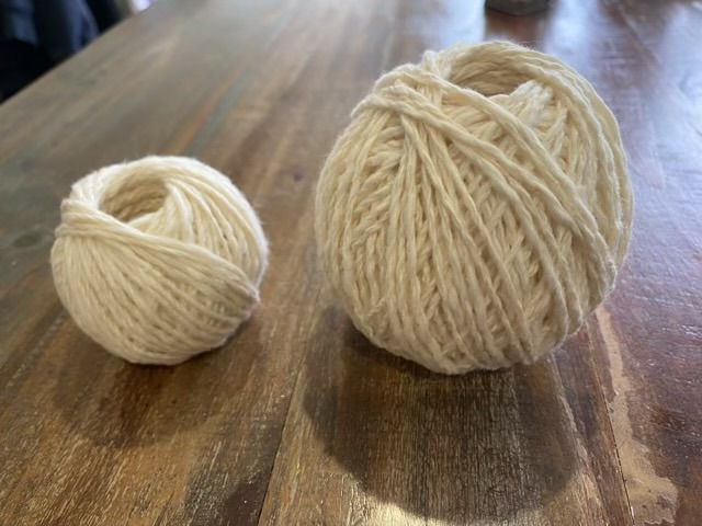 Photo description: two nostepinne style balls of cotton yarn, chain ply on the left, crepe on the right
